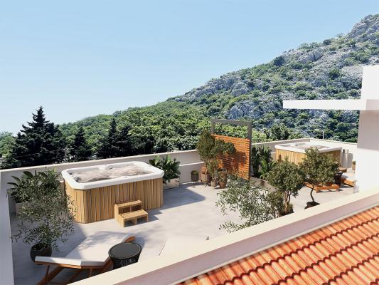 Apartmanima na posljednjoj etaži putem lifta omogu?en je izlaz na krovnu terasu. Terasa je drvenom pregradom i zelenilom podijeljena na dva dijela koji od sadržaja nude ?akuzi. Lijep pogled, dovoljno prostora za lezaljke i suncobrane ovaj prostor ?ine vrlo prijatnim.